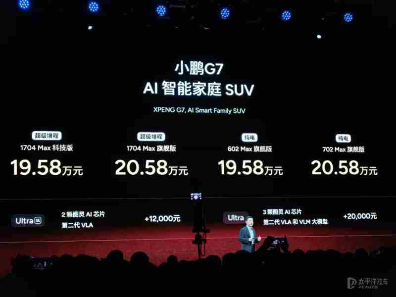 【太平洋汽车 新车频道】1月8日,在小鹏汽车2026全球新品发布会上,小鹏G7(询底价|查参配)增程版正式上市,推出四款车型,增程版两款,纯电版两款,售价区间为19.58-20.58万元。新车搭载小鹏第二代VLA(2026年第一季度推送)和图灵AI芯片,算力可达2250TOPS。小鹏G7 增程版的纯电续航里程为430公里,综合续航里程可达1704公里。