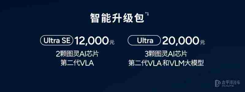 选装方面,新车提供Ultra SE智能升级包和Ultra智能升级包,选装SE升级包,将获得两颗辅助驾驶图灵AI芯片、第二代VLA和OMS舱内摄像头。选装 Ultra 升级包后,将在 SE 升级包的配置基础上进一步新增以下配置,一颗智能座舱图灵AI芯片、尾部Ultra字标、小P管家(车端VLM大模型、全天候主动服务、全场景自由对话)、面容ID录入及管理等功能。