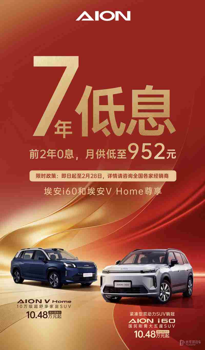 广汽埃安i60和V Home推7年超低息方案 前2年0息/月供952元
